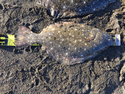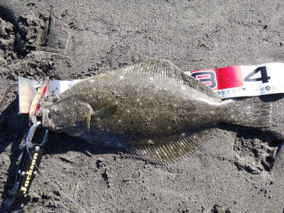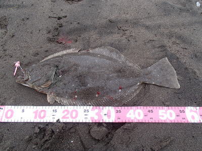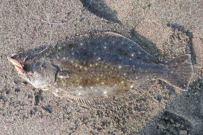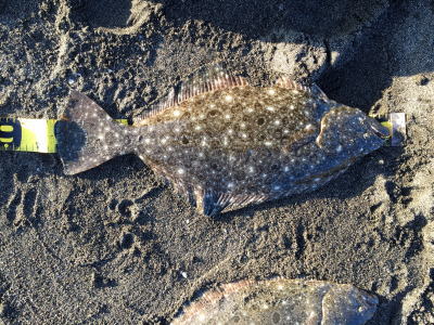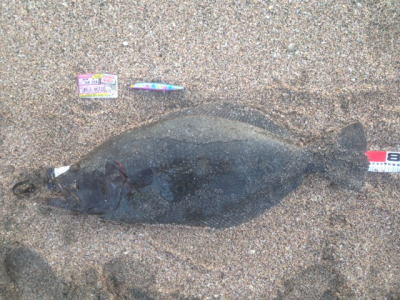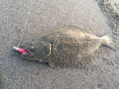 | ライズヒラメ釣ったぞ | 波打際近くなったのでルアー回収しようとした瞬間!目の覚めるようなアタリでびっくりしました。 南西微風 ただ巻 南に流れる潮が若干早かった。 | |||