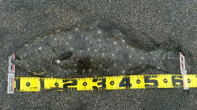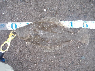 | サイズはともかく、納竿で釣れてホッとしました。 | 納めの1枚、狙っていたルアーでヒット | |||