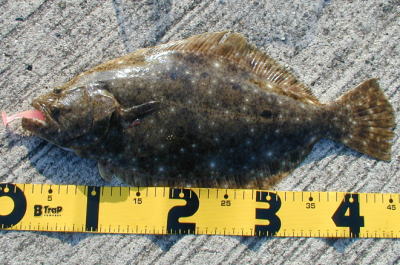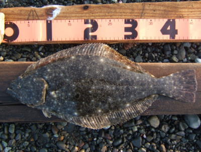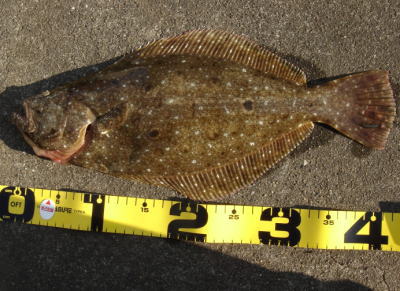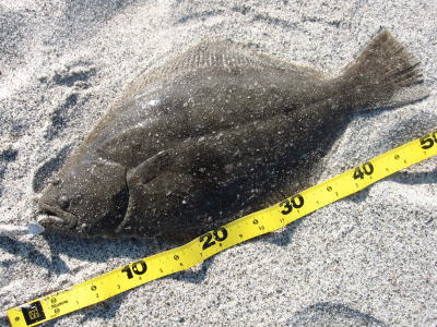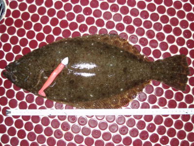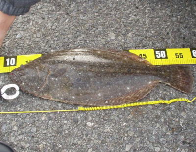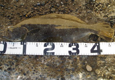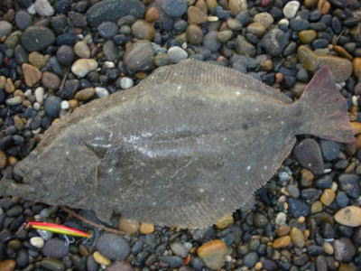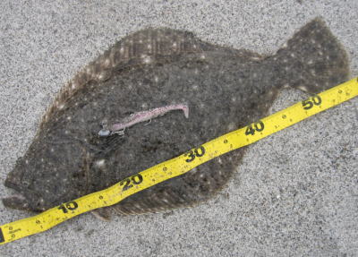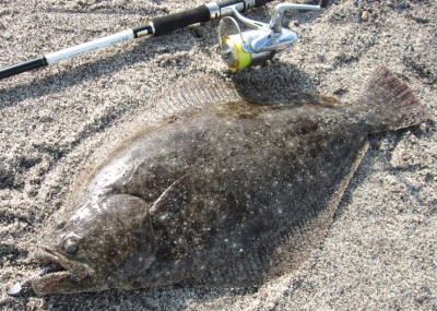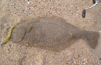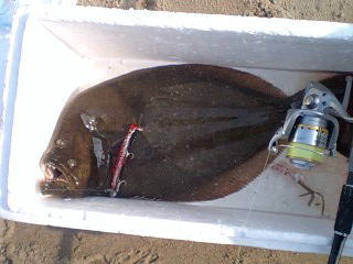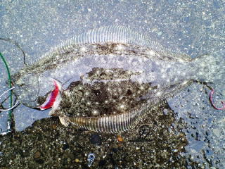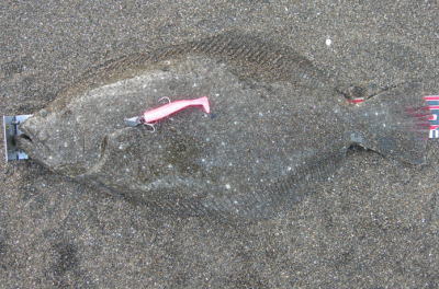 | 反応のあった場所にもう一度通したら掛かりました。他にソゲ1。 | なんとかヒラメサイズ獲れました! | |||