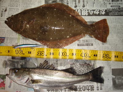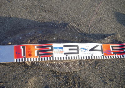 | ようやくヒラメと呼べるサイズが釣れました。この3連休は釣り三昧の予定です。 | 自己記録更新できました。 | |||