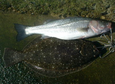 | シーバスと食べ比べると甘く柔らかくてヒラメの方が旨い! | 始めてすぐに足元でバラシ、その後すぐにヒット、護岸へゴボウ抜きしました。しかしかれこれ1年ぶりか・・。長かったなあ(^O^) | |||