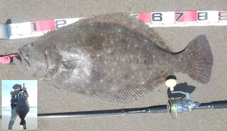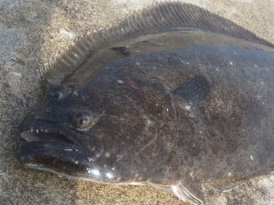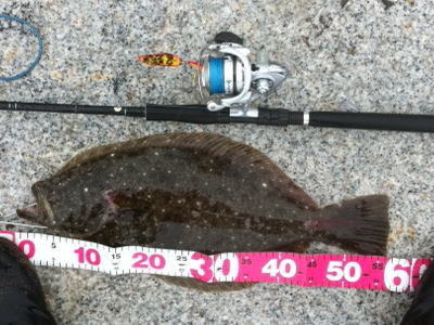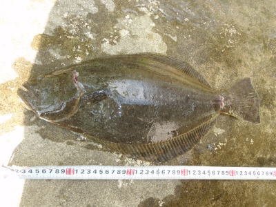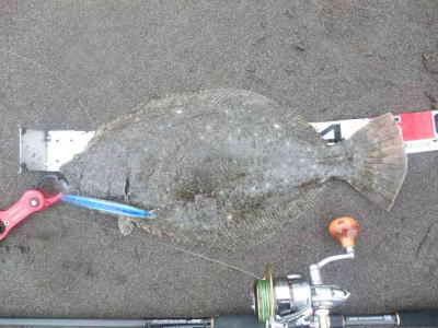 | ヤット、初ヒラメを釣りました。 | 重量感のある引きでした。 | |||
