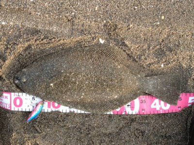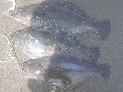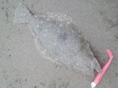 | 今日は、ヒラメのアタリの日みたいです!私の他、5枚ほど同サイズがあがってました! | 雨の中頑張りました | |||