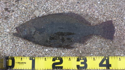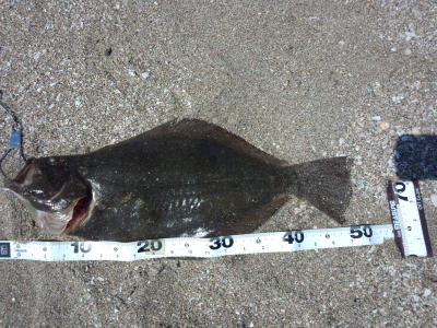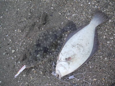 | 暗いうちにヒット。抵抗もなく上がってきたのでゴミかと思いました。 | 久しぶりのヒラメでした。 | |||
