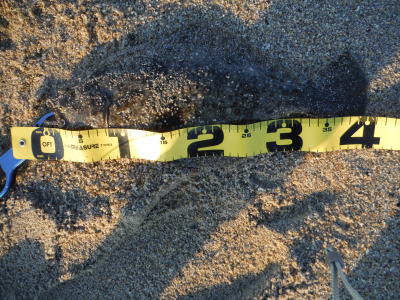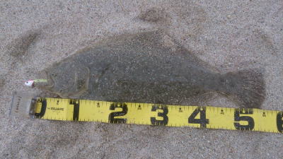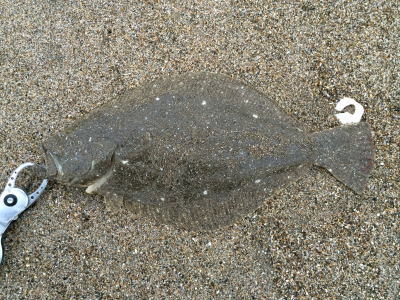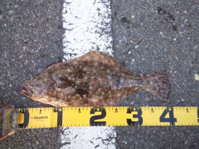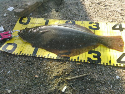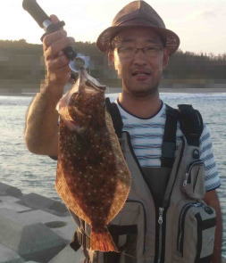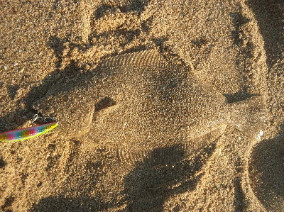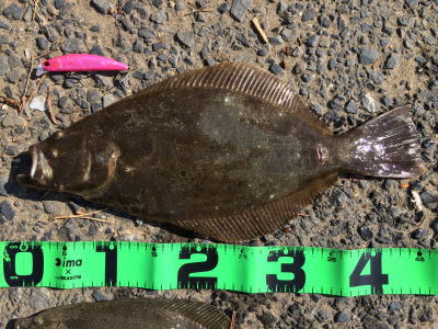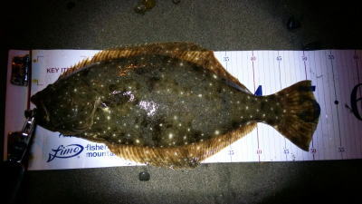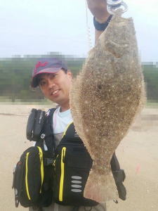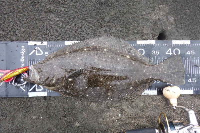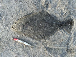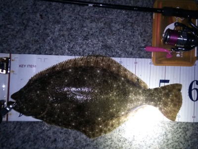 | 濁りが入っていてダメかと思いましたが気力で引きずり出しました。 | サイズはいまいちですが、約2ヶ月ぶりにヒラメと御対面できました。 | |||