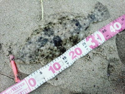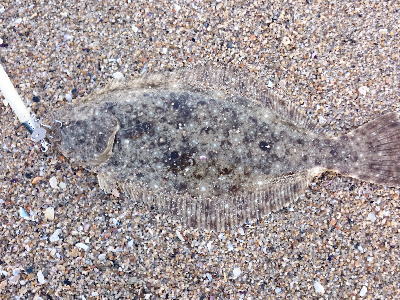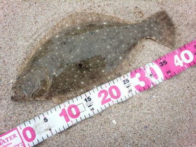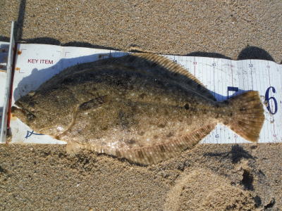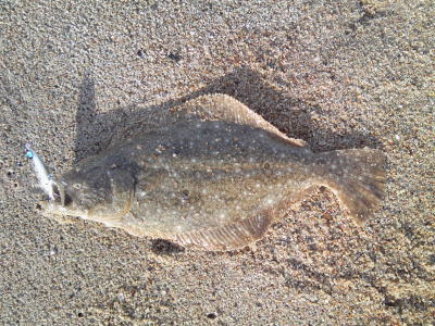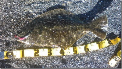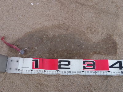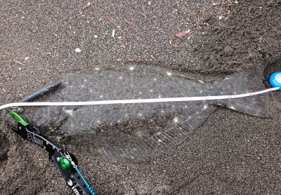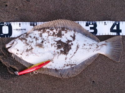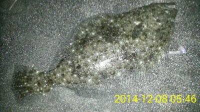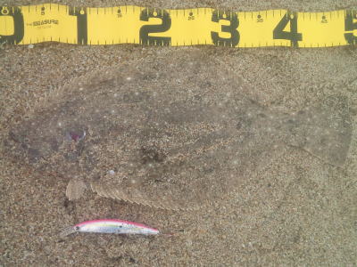 | 昼間だったのでどうかなと思っていましたが,出ました。カレント脇,20m程沖でヒット。 | ギリギリサイズでした。 | |||