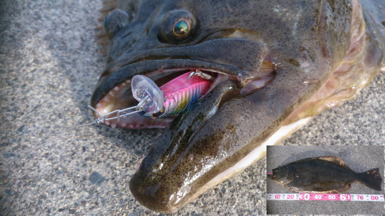 | 風を嫌い、より遠くに遠投しボトムレンジをキープするようにさびいてきたら、カケアガリからドン! | 二日がかりでキャッチできました。 | |||
