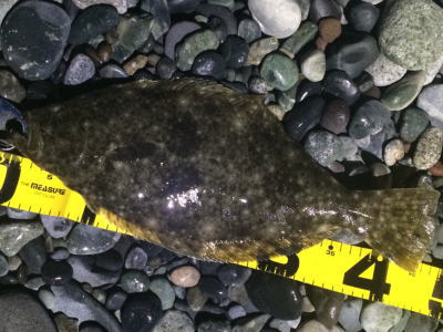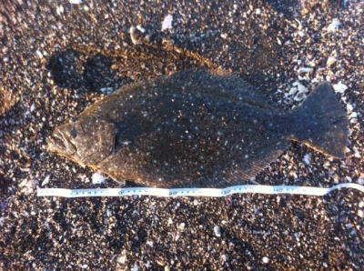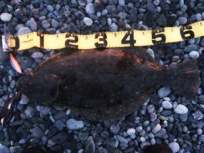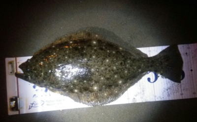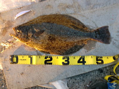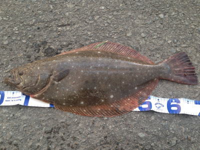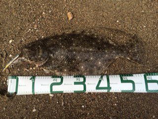 | 今年の初ヒラメでした。少し離れたところでは、なんと、赤ちゃんを背負ったアングラーもヒラメを釣られていました。 | 渋いけど朝マズメに一発釣れました♪ ウレシ〜♪ |