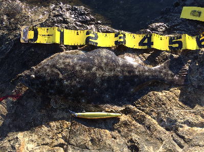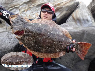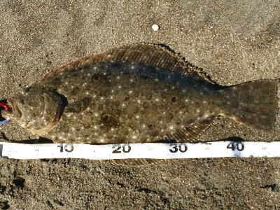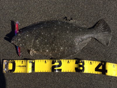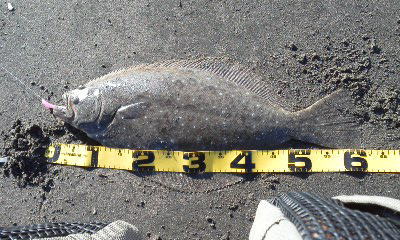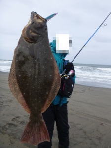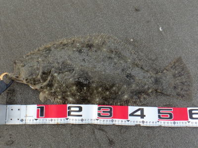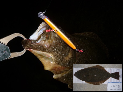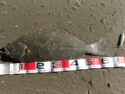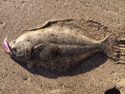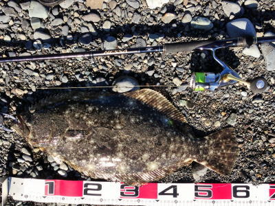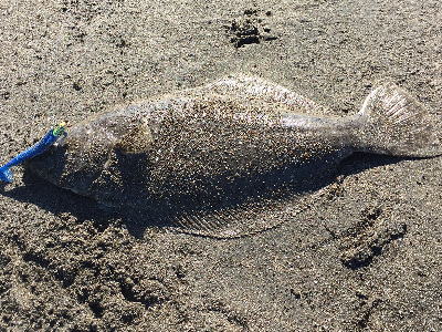 | 波は穏やかで、約200m沖まで茶色く濁っていたので、ボトム付近をスローリトリーブして、今年の初ヒラメをキャッチ。 | 初めてナイスサイズを釣りました。 | |||