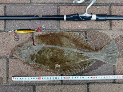 | 今年初ヒラメO(≧∇≦)O | ジグをしゃくり上げてフォール中にヒット! 約1年ぶりのヒラメサイズです。去年はソゲしか釣れなかった・・・ |