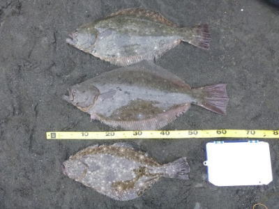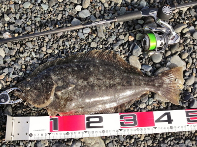 | 今年初釣行、激シブでしたが、何とかヒラメサイズ釣れました。この他にソゲ1枚。 | 粘ってなんとか… | |||