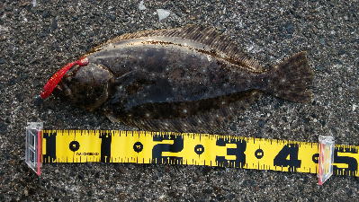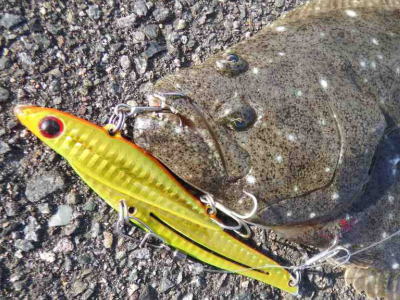 | サイズはともかく、納竿で釣れてホッとしました。 | 納めの1枚、狙っていたルアーでヒット | |||