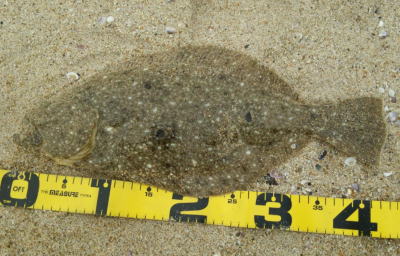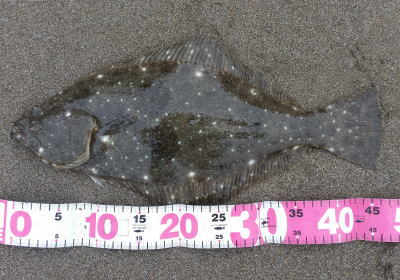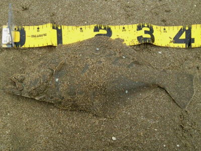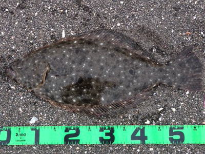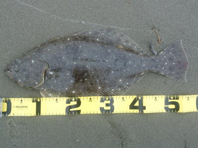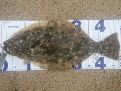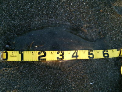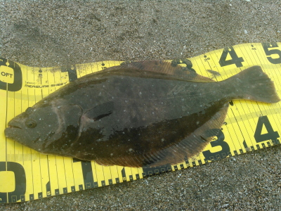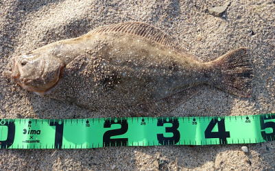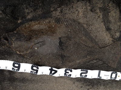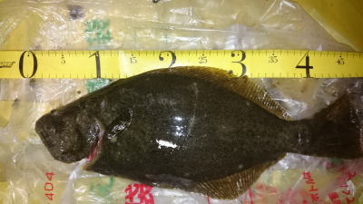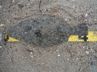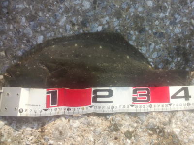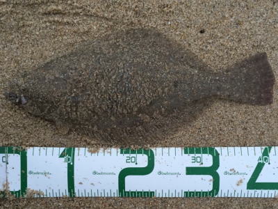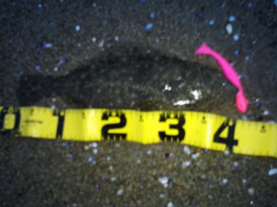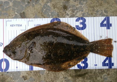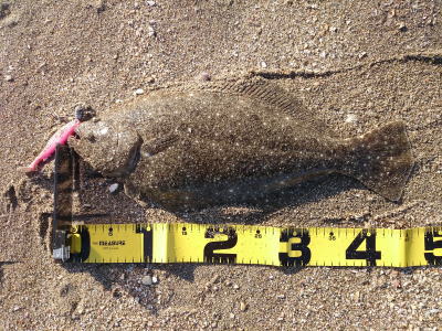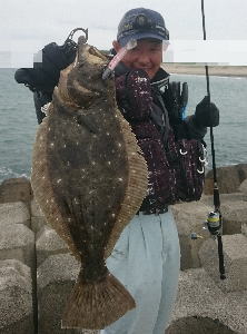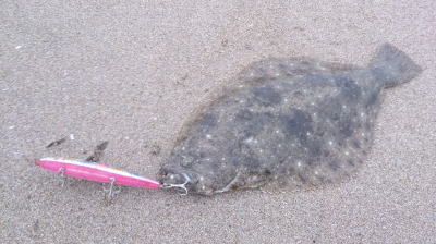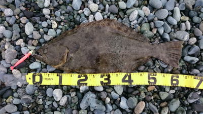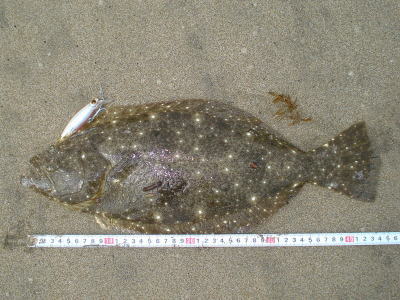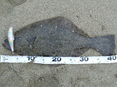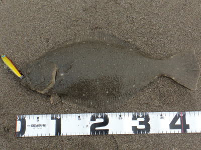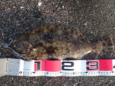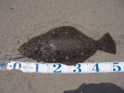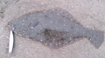 | 潮位が下がったのに、案外、近い場所でヒット。波も小さくなり、流れが緩やかになったので、釣り方はスローリトリーブのみ。 | 今年1枚目 | |||
