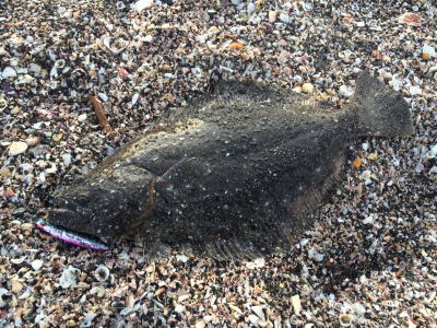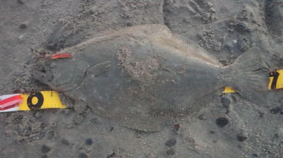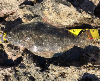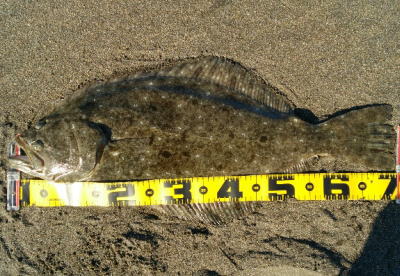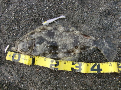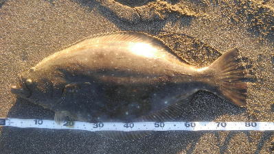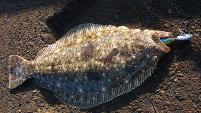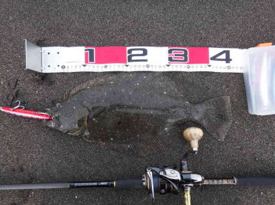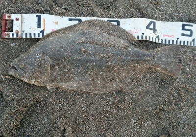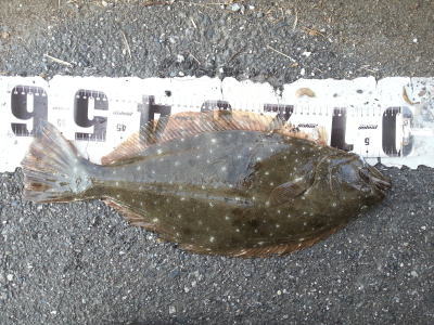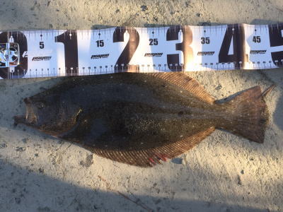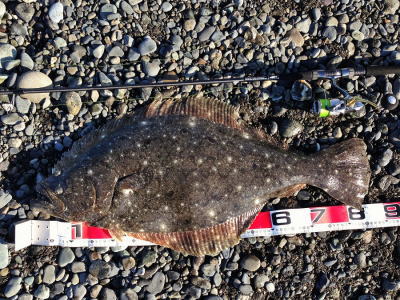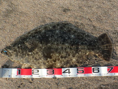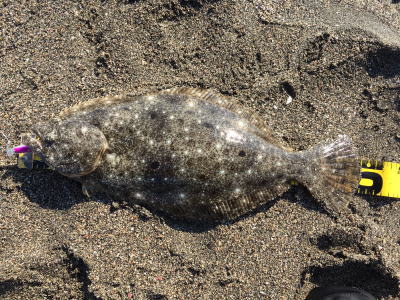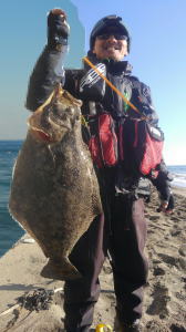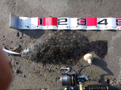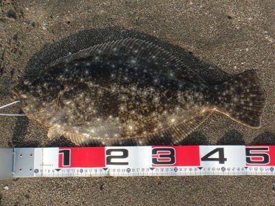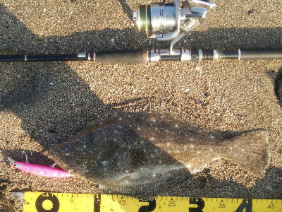 | なかなかこのサイズを超えることが出来ません。 | 今年3回目の釣行で初ゲット。波打ち際より10m位の所でヒット。少し遅いお年玉です。 | |||