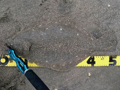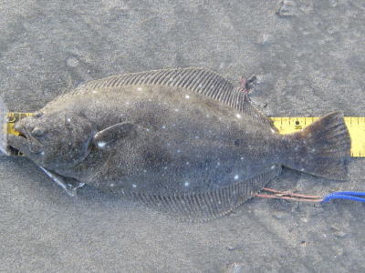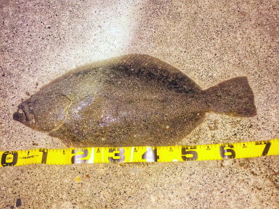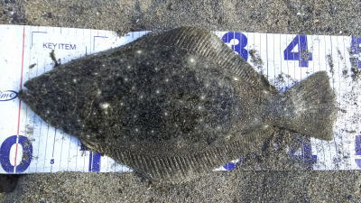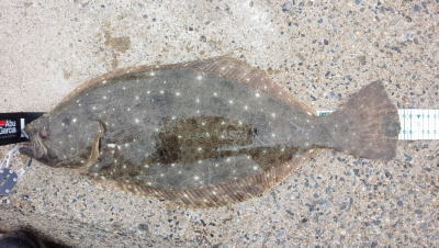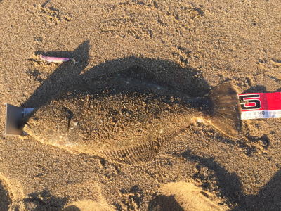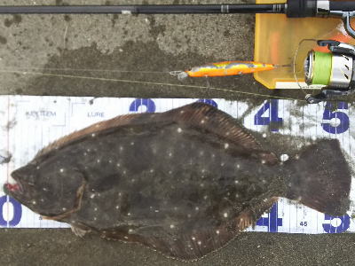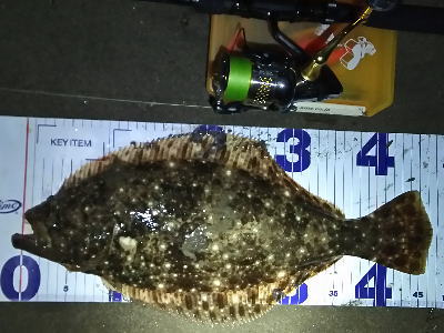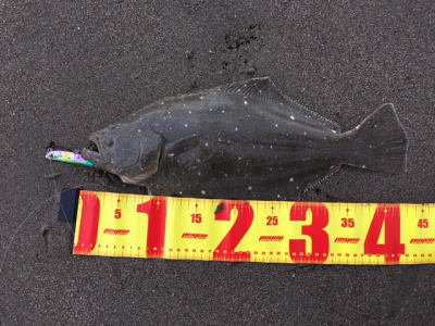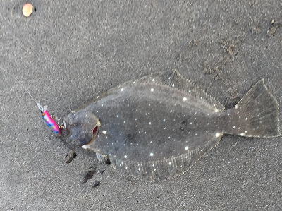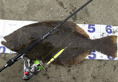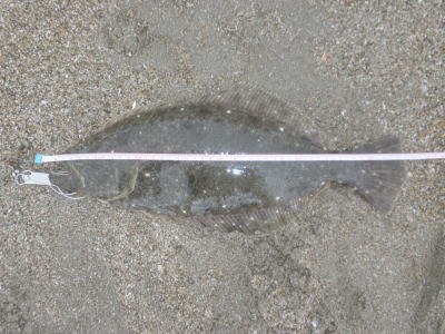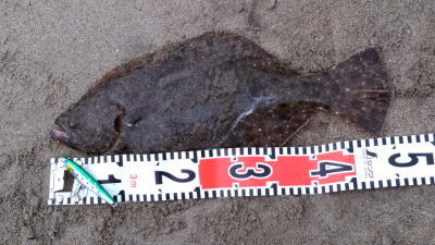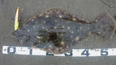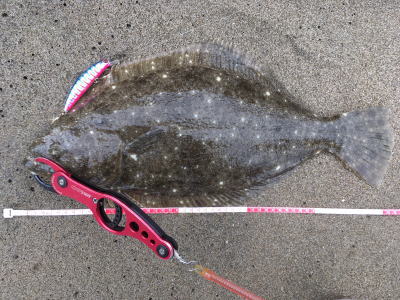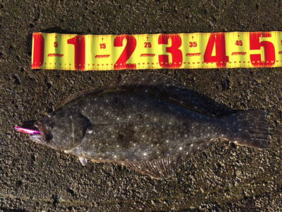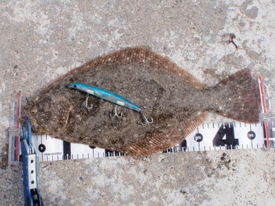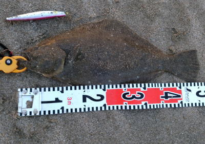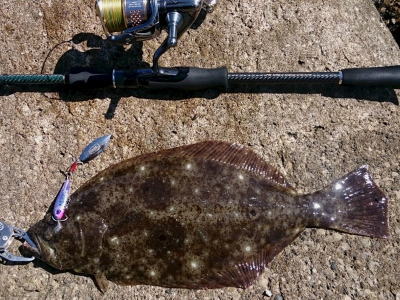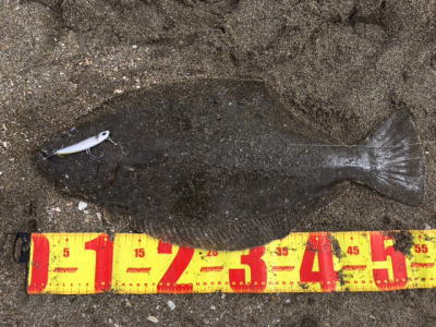 | 真正面からの強風の中手前探るもノーバイト。なので遠投しカレントのヨレを狙うとヒットしてくれました。 | シーバスは5本出ましたが、ヒラメはこれだけ・・・ | |||