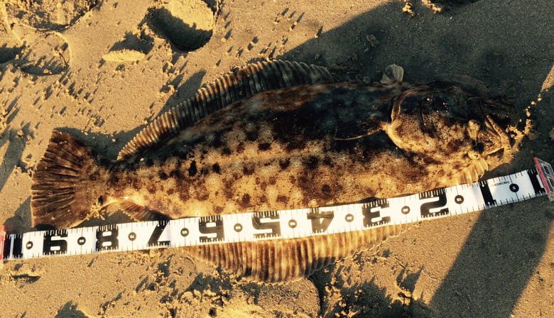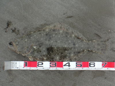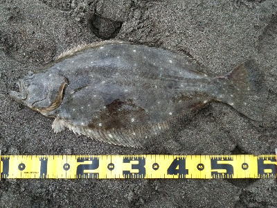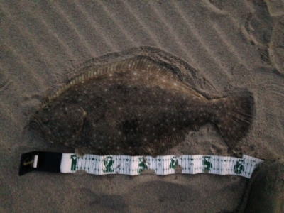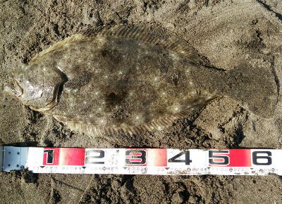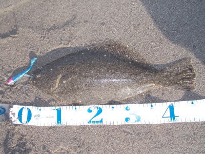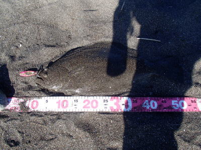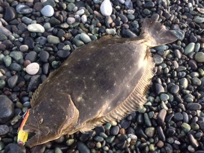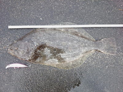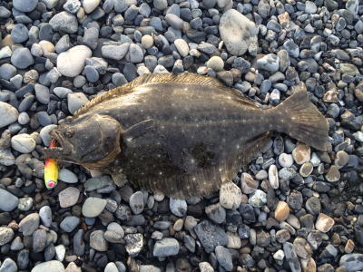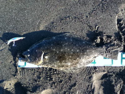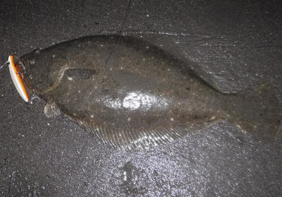 | 青物狙いでワラサをバラシ、ルアーチェンジして回遊待ちしていたら、波打ち際でずっしりと重みが乗り、エイかと思ったらヒラメでした。 | ||||