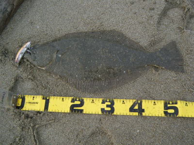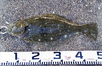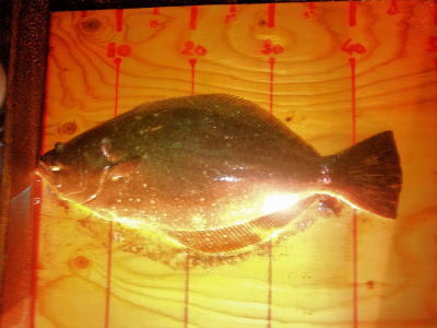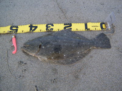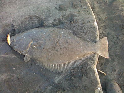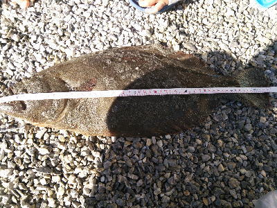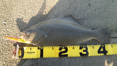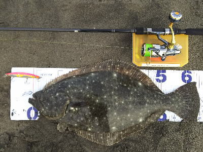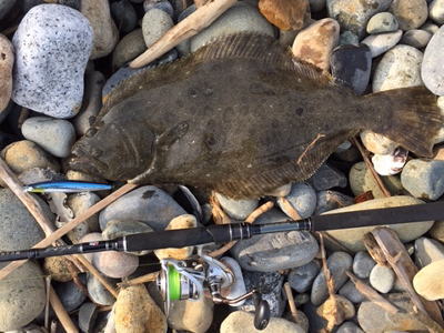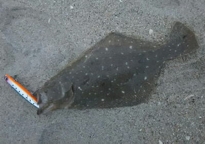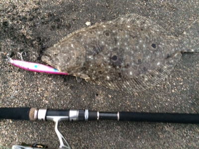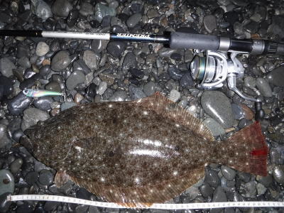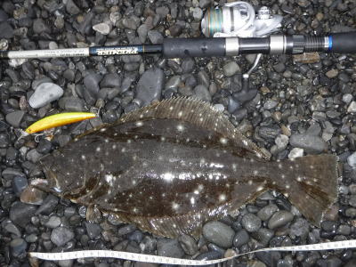 | やっとヒラメサイズ捕獲に成功! | ルアーを変更して直ぐ、根掛かりと思う当たりでした。 | |||