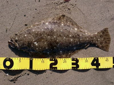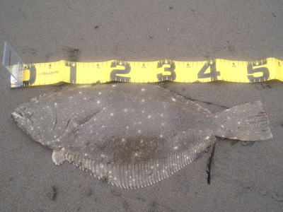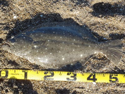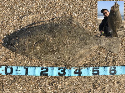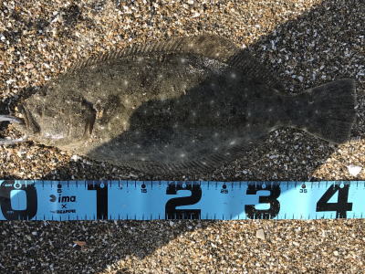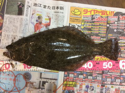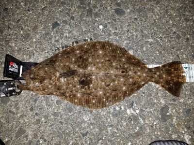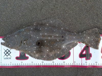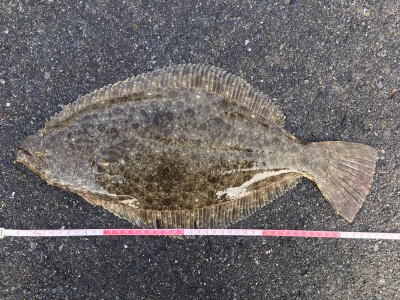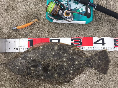 | --- | 根と根の間を上手くトレース出来ました。引きが強く50あるかと思いましたが、、小振りですが肉厚!メジャー失念しておりすみません。 久しぶりにヒラメのライズを確認、活性は悪くなさそうです。その他、ソゲ2枚でした。。 |