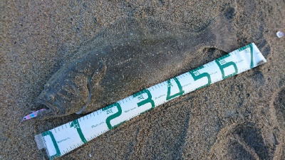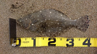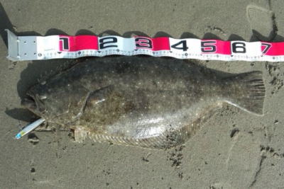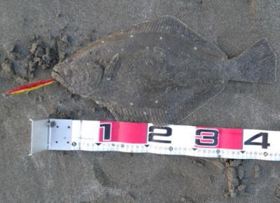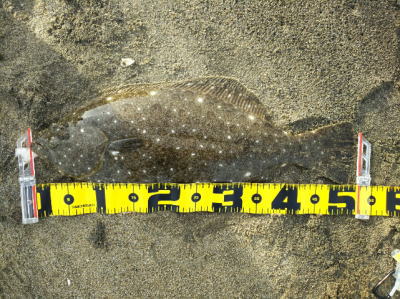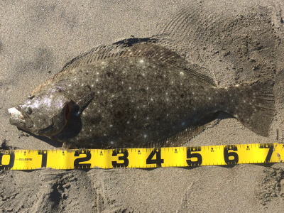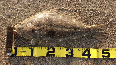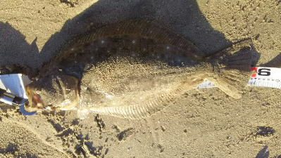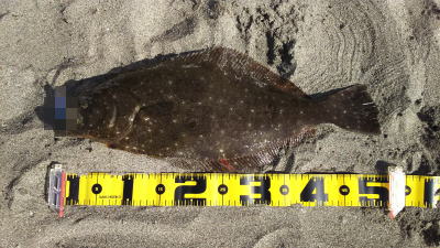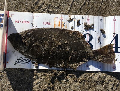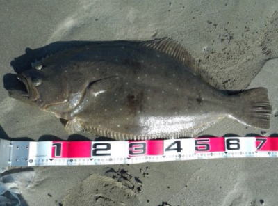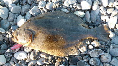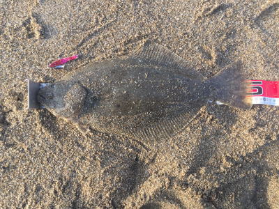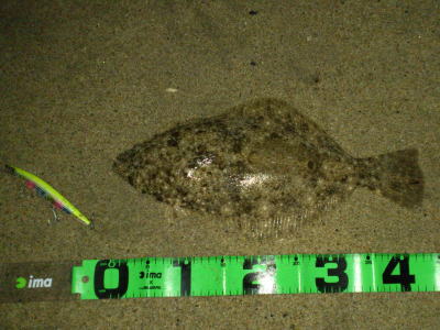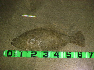 | 初ヒラメなので感動しました! 波も穏やかで無風、下げ止りからの上げ始めでした。ブレイクライン奥にフルキャストから煽りを入れて巻きはじめて直ぐにグンと乗りました。 |