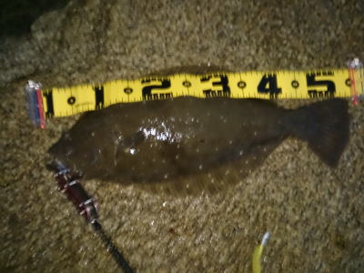 | イワシが接岸中との事で!仕事終わりに夕飯の時間までと!チョイ近所の突堤に何か釣れないかな?と出撃!あたりは真っ暗になってからのヒラメは初めてだったので!ちょい小さめですがナイトゲームぽいシチュエーションで釣れたのでちょっと感動しました! | 捨て石正面のヨブでヒットしました。 | |||