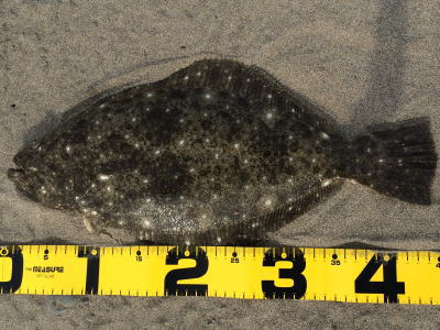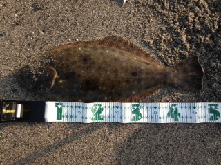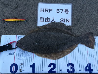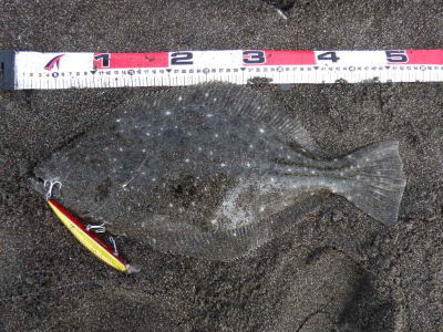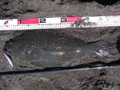 | このヒラメをゲットした20分後、レッドをゲットすることが出来ました。 | 朝一昨日のポイントに入ったが、北東の強風と横潮流に悩まされノーバイト、周りで釣れたのはシーバス3匹のみ。 午後から別のサーフに移動し、何とかボウズは免れました。 |