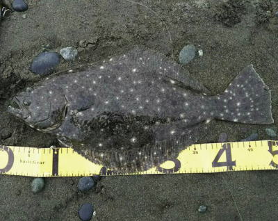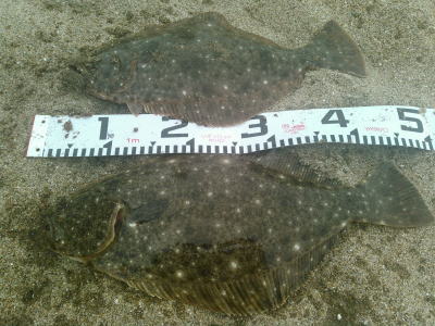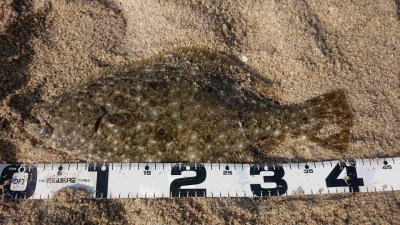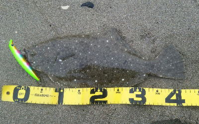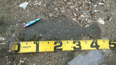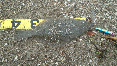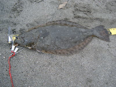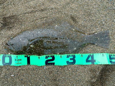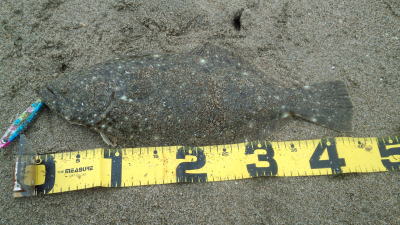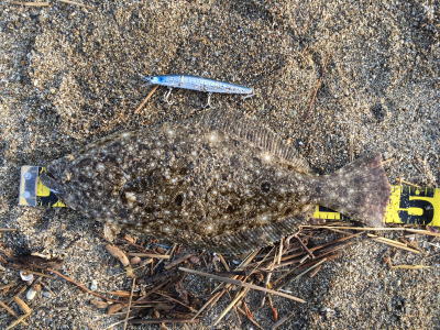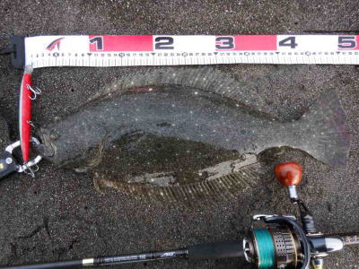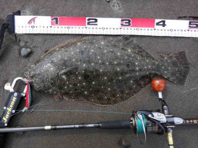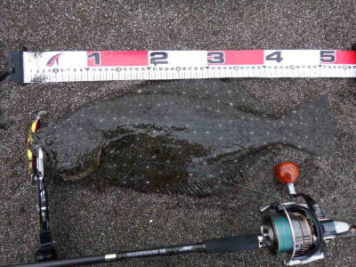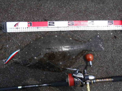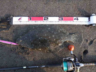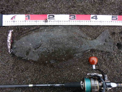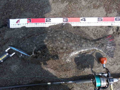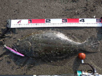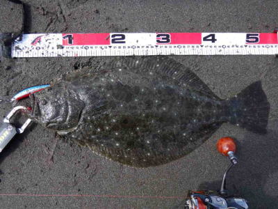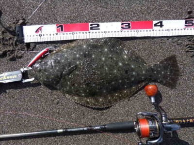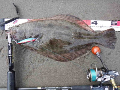 | 庄内サーフでの初ヒラメ | シンペン日和の凪、追い風微風。上げ潮。3拍子整いました。デッドスローでガツンときました。 | |||