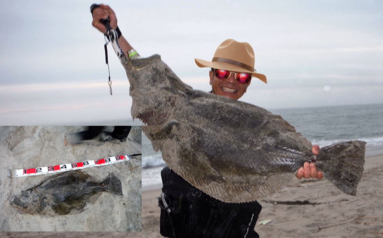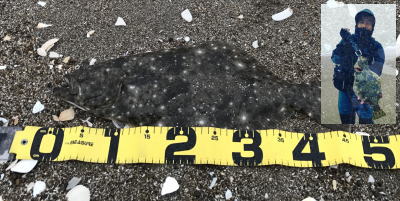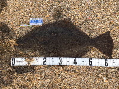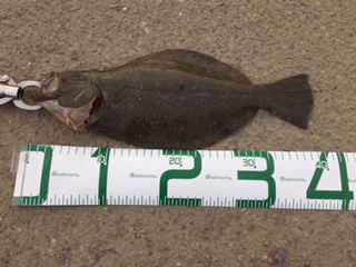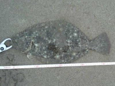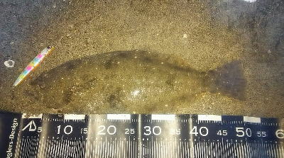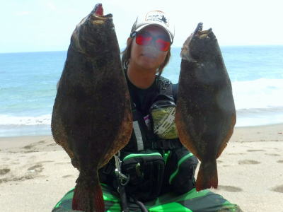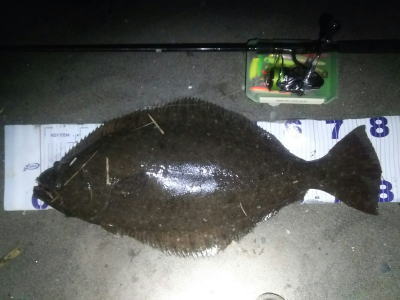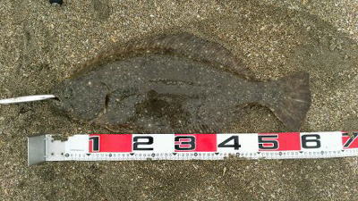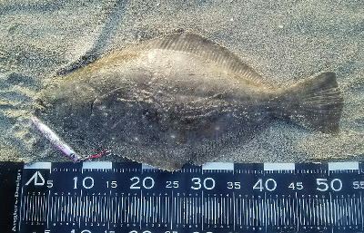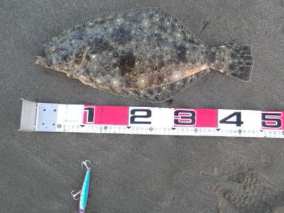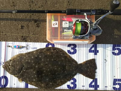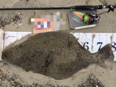 | 有給爆弾投下!大雨の中頑張りました。 | 当日は波が高かったが、波か潰れた時を狙ってキャストして当たりがあり、久々のヒラメサイズを釣り上げました。ソゲは何枚も釣っていたので嬉しかったです。 | |||
