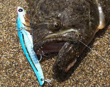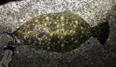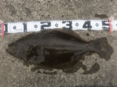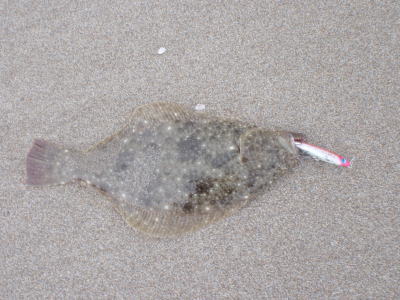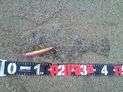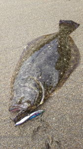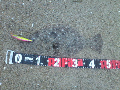 | 波は高めだったけど、波の落ち着いた時を狙ってキャスト、巻いている時に急に重くなり、また海藻が引っ掛かったと思ったら弱冠の生命反応で釣り上げてみれば、何とかヒラメと呼べるサイズでした。 | 鬼合わせでキメました(^.^) | |||