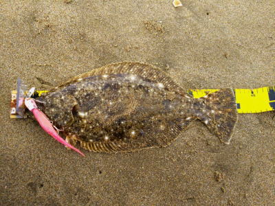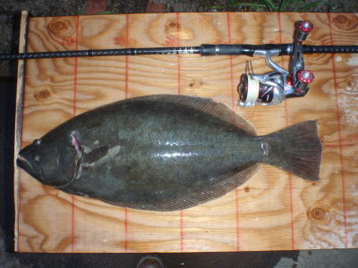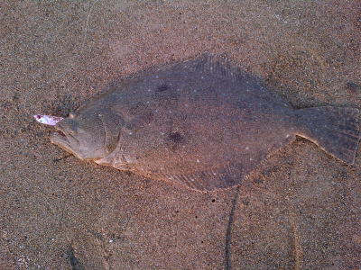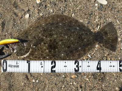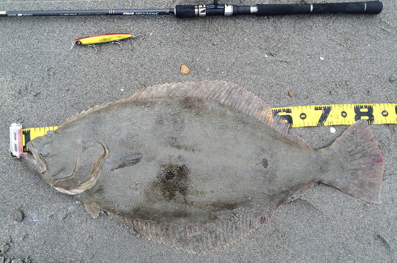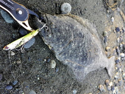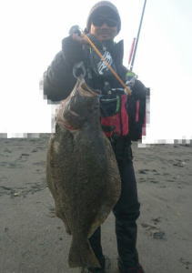 | 初の座布団ヒラメで感無量でした。 コノシロが当たったので、かっ飛び棒に替えて流れ出しまでフルキャストし、ボトムを取ってゆっくりただ巻きでヒット!当時は凪で風も弱く波も低く釣りやすかったです。 |