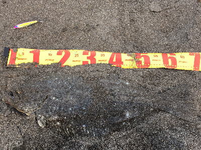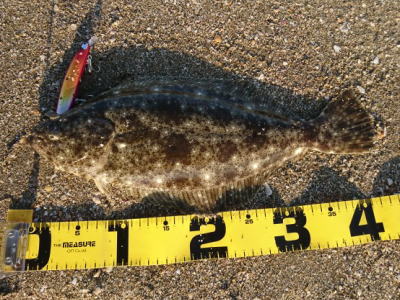 | 突堤先端に、スナメリに追い立てられるコノシロ発見!結構遠目だったので、手持ちのジグで重そうなのに急いで交換!着底〜リフト&フォールですぐ答えが出ました^^v | コノシロの群れが先日よりも多く接岸してる様子なので、潮目に当たる3〜4メーターラインの地形変化とコノシロの群れが重なるであろう場所を丁寧に探ってみました!72cmの他にも良型が2枚、計3枚の釣果でした!コノシロ付きのヒラメは数も出やすいし、型が良いので大満足です^^v | |||