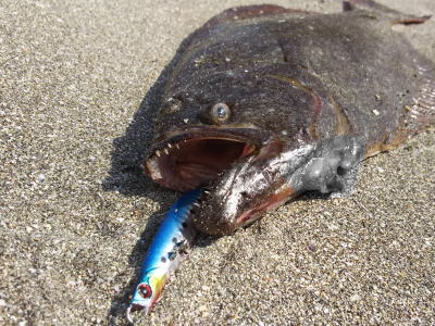 | 見るからに60センチオーバーがかかり、タモに入らずあれこれ格闘中に大波に揉まれて堤防下に潜り込んでラインブレイク。その10分後でした。取り込み中にルアーフックがタモ網に引っ掛かったので、そのまま引っ張り上げに成功。 | 斜め45°でゆっくり巻いてきたら釣れました! | |||