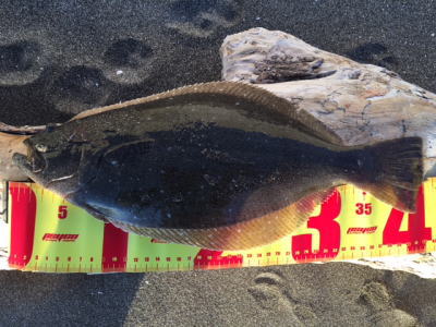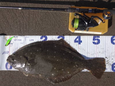 | シャローサーフでボトムをスローに誘い、久々にガツンと来ました(*^^*)♪ | シーバス狙いで出撃したら!ヒラメが釣れてくれました( ^ω^ )ニコニコ | |||