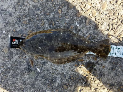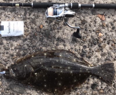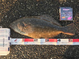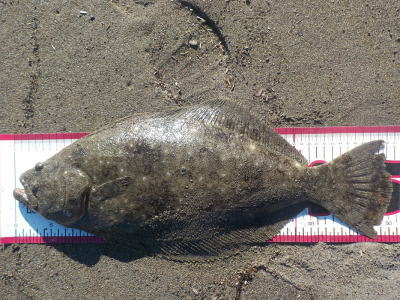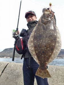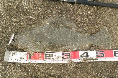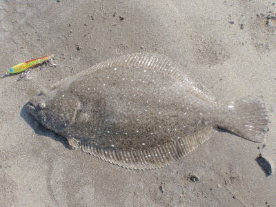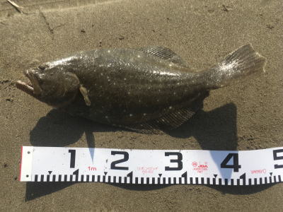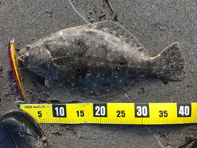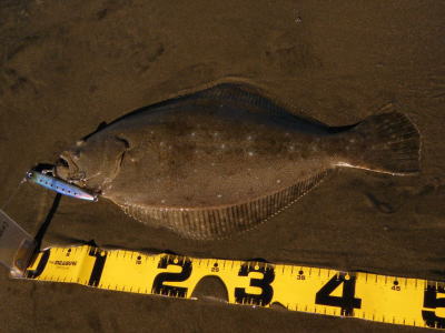 | かなり遠投して沖のヨブカケ上がりでヒット一度外れたんですが軽くしゃくったら追い食いしてきました。今年初のいいヒラメでした。 | 2日前にバイトがあったけどフッキングに至らなかったポイントを再度攻めてみたところ、居ました。里帰りしている娘たちに食べさせることができます、ヒラメに感謝! | |||