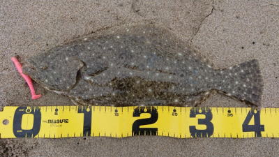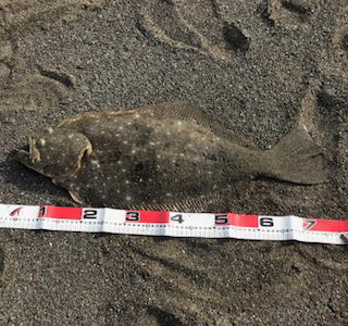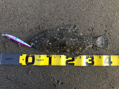 | 南房サーフで厳寒期の貴重な1枚、サイズ関係なく嬉しかったです。 超デッドスローのただ巻き。フグも4匹ヒット(笑) ベイトの気配は全く無かったです。 |