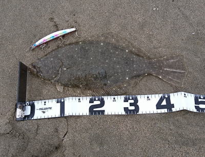 | --- | 朝の県北サーフではソゲ1枚に終ったため、夕方に好調の県央サーフで短時間のリベンジマッチ。最後の一投に食らいついて来てくれました。 | |||
