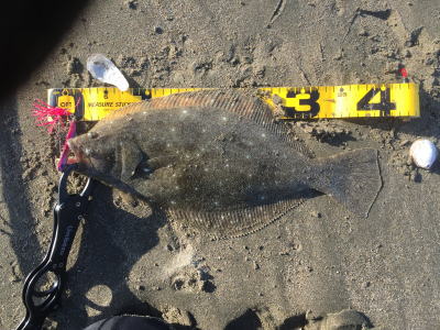 | 初めて行った千葉のサーフでの一枚 | 15分後に釣ったヒラメです | |||