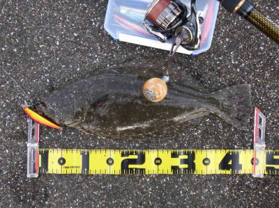 | 潮止まりで休憩しようと思っていた時、ヒットしました。 | 久々のヒラメの引き最高できた!! | |||