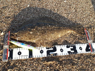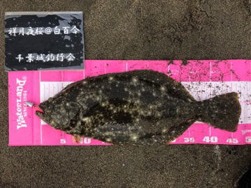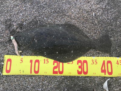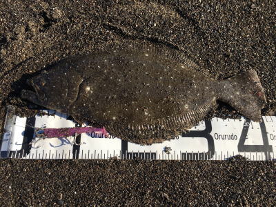 | --- | 上げっぱなのタイミングでこのヒラメ以外にソゲ1枚と70アップのシーバスが短時間で釣れ、良い釣りが出来ました。 | |||