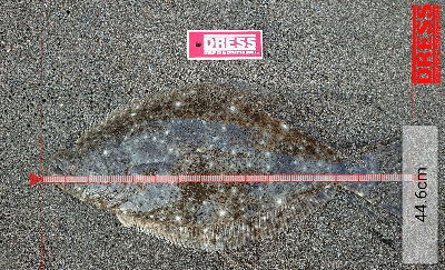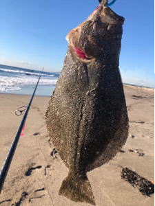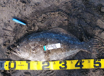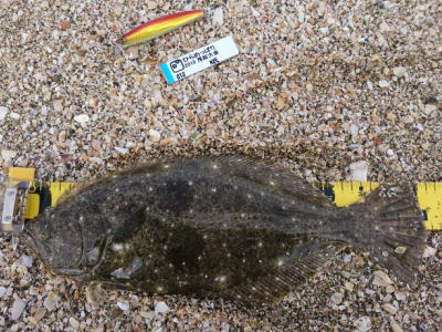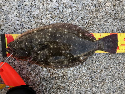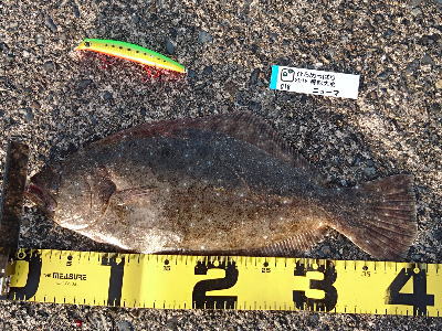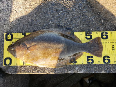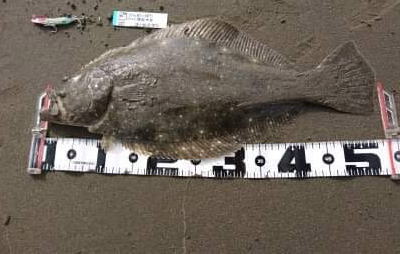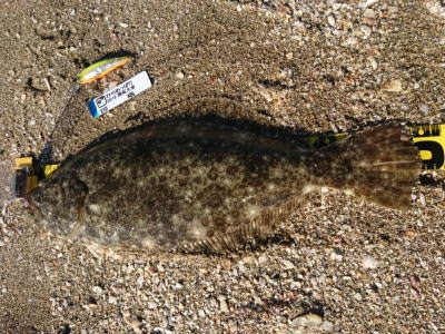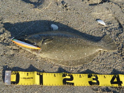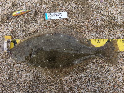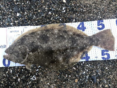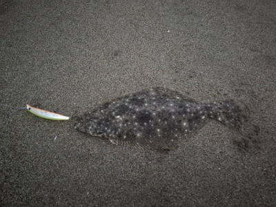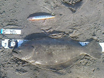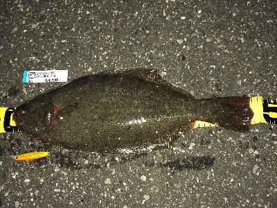 | ナイトヒラメ初ゲットです! | 縦潮流を横にスローリトリーブ。狙い通りガツンとヒット! 久々のヒラメサイズでした。 |