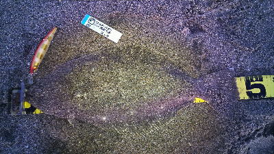 | 初エントリーです。ルアー着水して、巻き始め直ぐにhit!しました。フロントフックに掛かってたので、下から食い上げた感じでした。 | タテのアクションで、フォールからの巻き始めでhitしました。 | |||