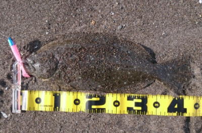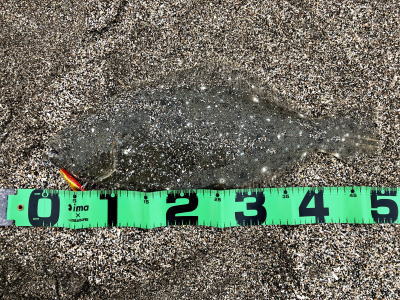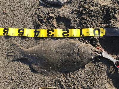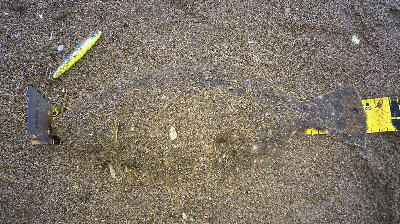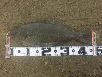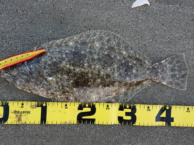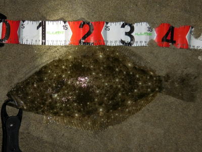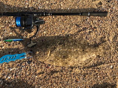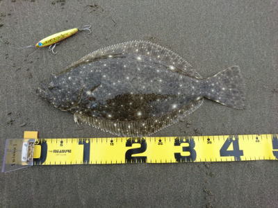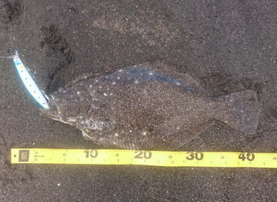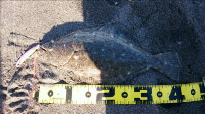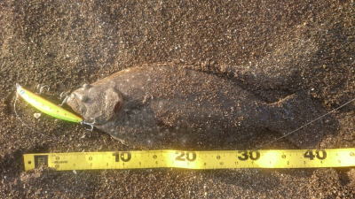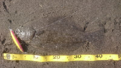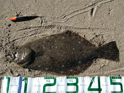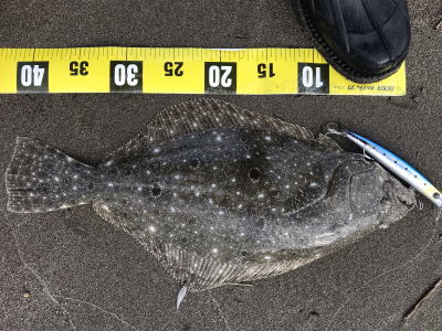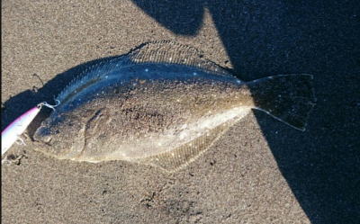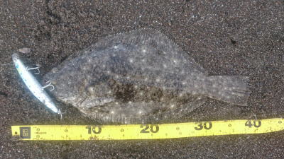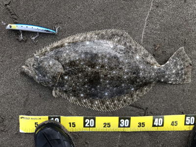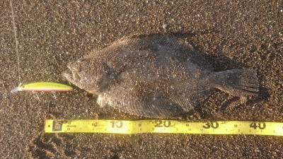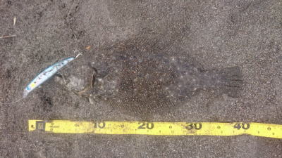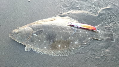 | 外房サーフの流れ込み前でした。近くで先にソゲを釣っていたので、めずらしくも釣れる気満々で挑み、久しぶりに一枚釣れました。タダ巻きでした。 | 3年越しで初のヒラメサイズです。南房の流れ込みそば、沖の左右ブレイク間のカレント、時折ベイトが手前で跳ね、付近で海鵜が頻繁に潜るのを確認。沖にルアーが底を擦る瀬で2度のバイトも乗らず、遠投系ルアーを中心に底意識のストップ・ゴーでヒットしました。 | |||