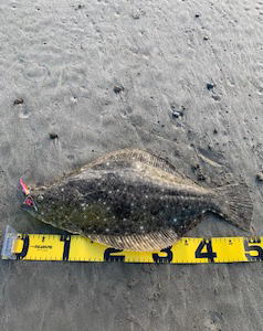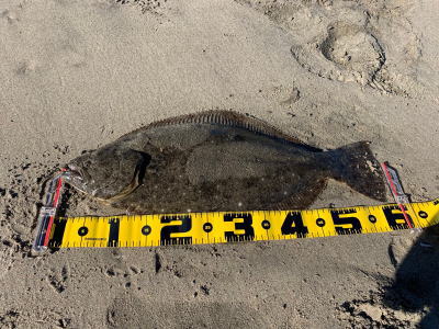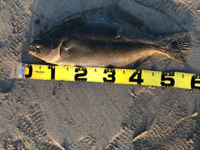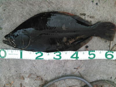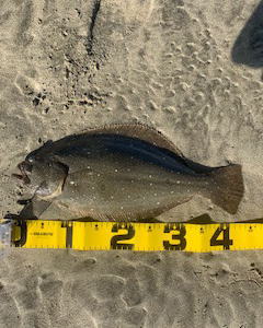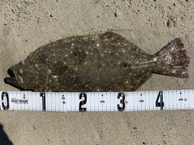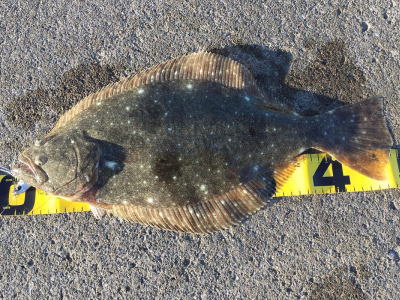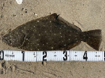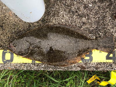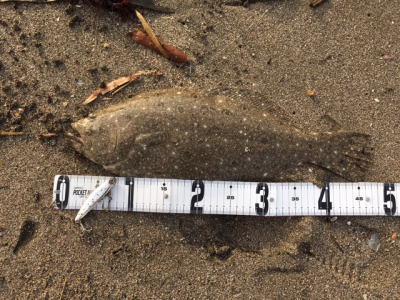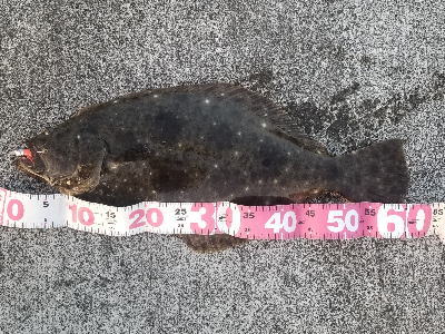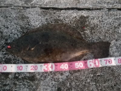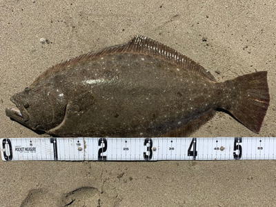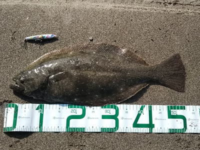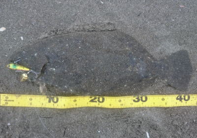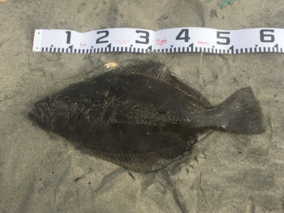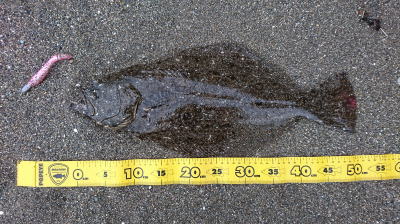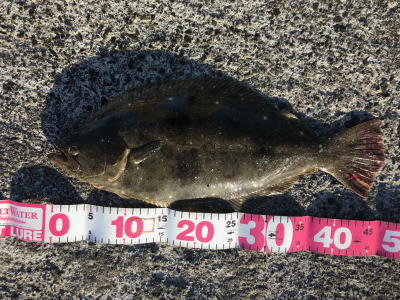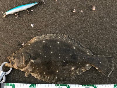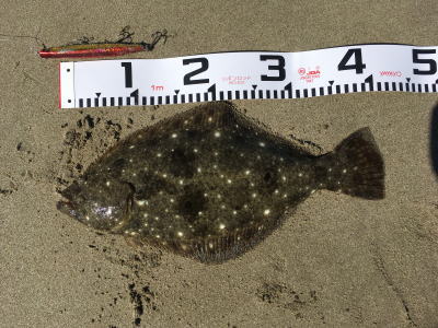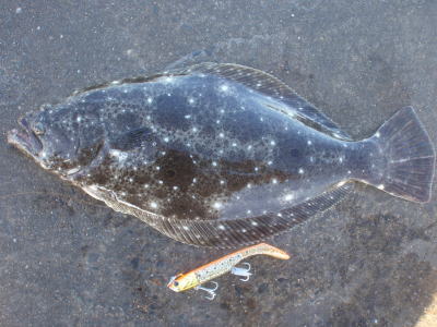| 久しぶりのヒラメでした! | 干潮近くでやっと届くくらいの沖で釣れました。 今朝は寝過ごしたので、「今日はダメだ」と思ってましたが、この後、コチも釣れて良い日になりました。 |