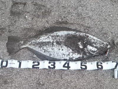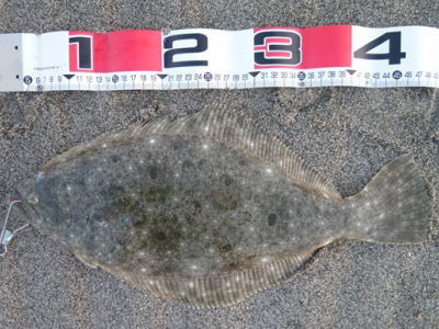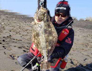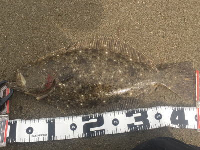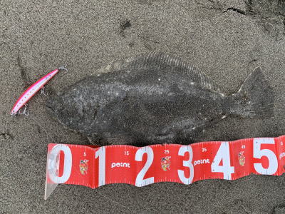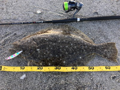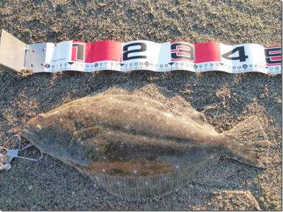 | 分厚さが半端ない綺麗なヒラメでした。 | そろそろ釣れるかな?っと思い 久々にサーフで釣りをしました。 アタリはまだまだ少ない感じでしたが、少ないアタリに合わせられて良かったです。 |