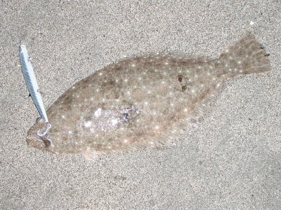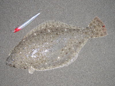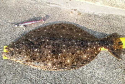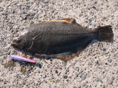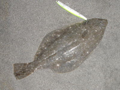 | 投げ始めて2投目でのヒットでした。 | 最近はイナダばかりでしたので久しぶりのヒラメです。 | |||