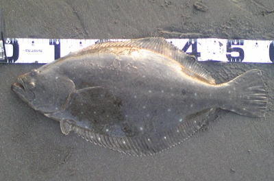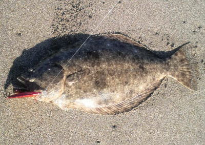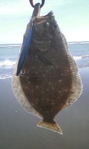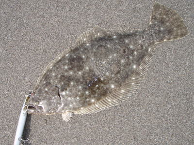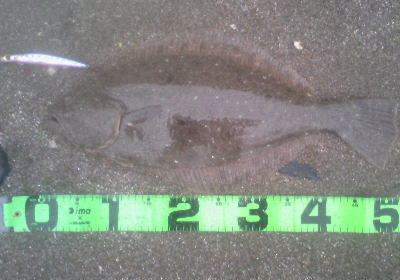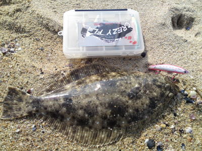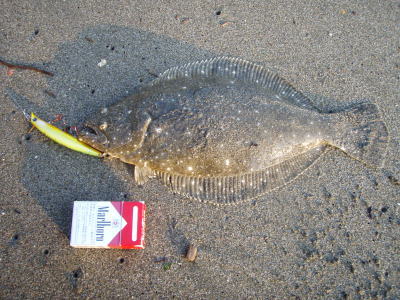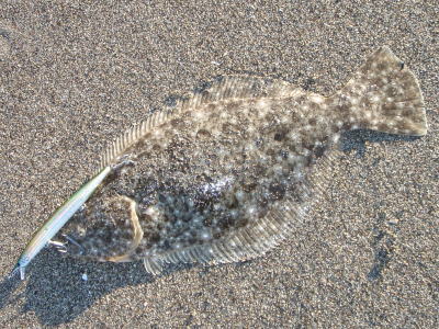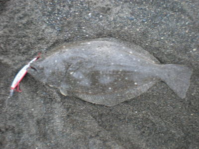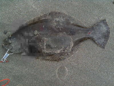| ずっと釣りたくて、生まれて初めて釣ったヒラメなので、最高にうれしかったデス。砂浜に上げた瞬間、雄たけびをあげました。 | 出張先で 初ヒラメをようやくGET | |||