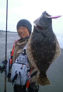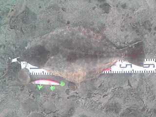| 無事竿納め出来ました。 | 朝の満潮で隣のアングラーが40upをゲット。私には全く当たりも無いまま昼過ぎまで粘って渾身の1匹がコレです。ヒラメ最高! | |||