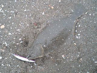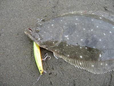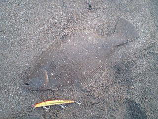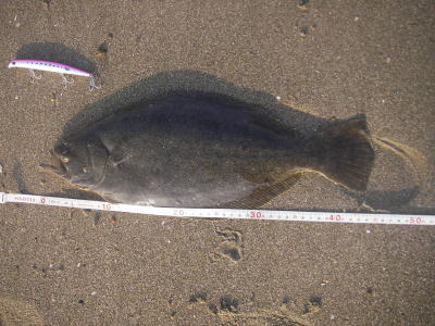 | ひさびさの連発(その2)。最初に波打ち際でバラシがありましたが、同じサカナが食ったような気がします。 | ようやく報告できます。帰省中 実家の近くの浜で 待望のヒラメサイズ いつもは愛知のサーフでルアーを波乗りさせてます。 | |||