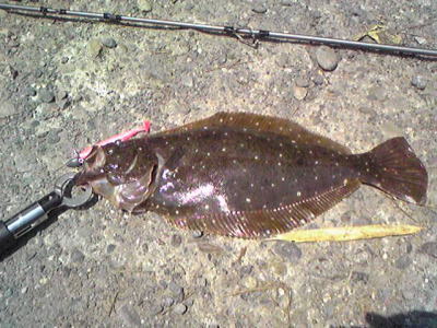 | いつも参考にさせていただいております。今期初のヒラメでとても嬉しいです(^^)。更なるサイズアップ目指して頑張りま〜す! | 久々ヒラメゲット。携帯にて撮影後突然の高波にて逃げられてしまった・・・(泣) | |||