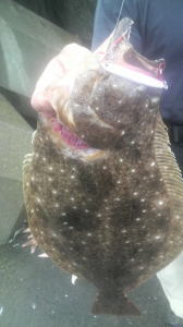 | 今シーズン初ヒラメです。たもあみ持ってこなかったので、気合いでぶち抜きました。 | 2日連続で釣れて非常にラッキーです。昨日に比べ引きが断然強いため、かなり慎重にやりとりしました。サポートに入っていただいたイトウさんありがとうございます。 | |||