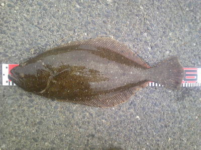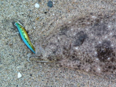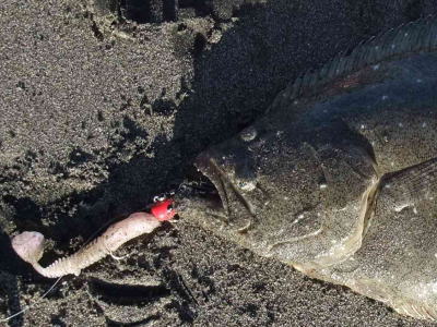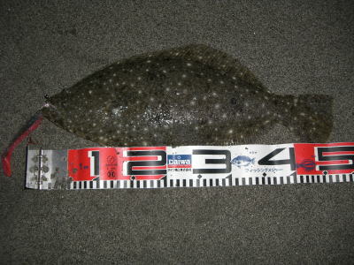 | 人気ポイントで釣り人多数、でも釣果はない状況。諦めかけましたが、粘りの釣りを決め込み最後と思った一投でヒット。粘ってみるものですね。 | 秋冬シーズン初ヒラメです。 | |||
